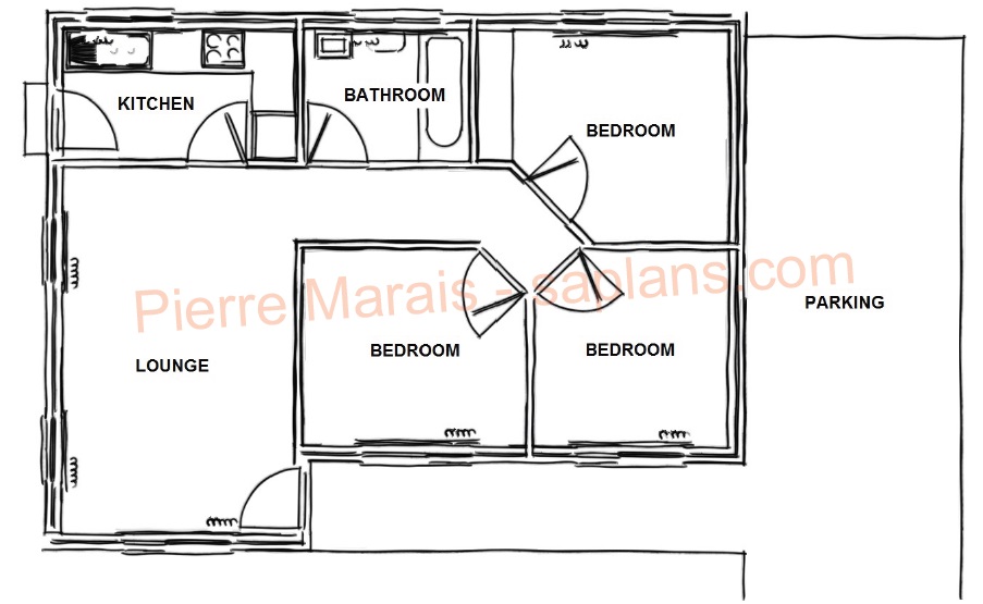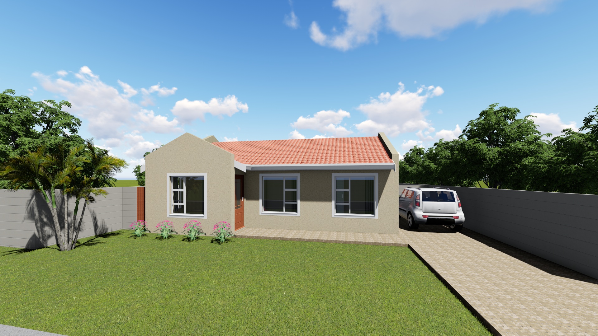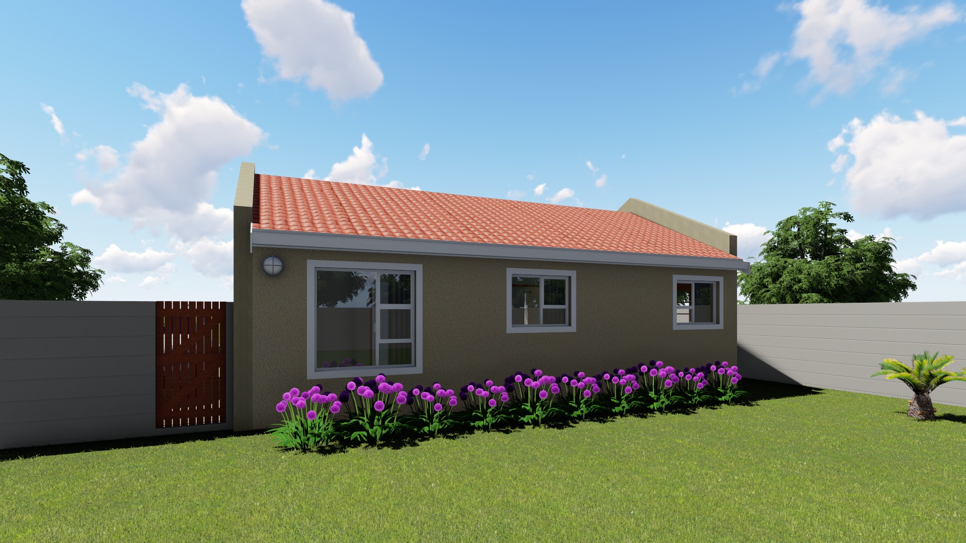 This is a very economical designed three-bedroom house. The Lounge area and two bedrooms have been designed to face north and capture maximum light and sun in colder seasons. The entrance leads into the Lounge Area with an Open Plan Kitchen on the side. The kitchen has a stove, sink and fridge. Both Bedrooms have built-in cupboards. The bathroom has a shower, hand basin and a WC.