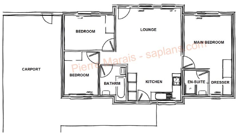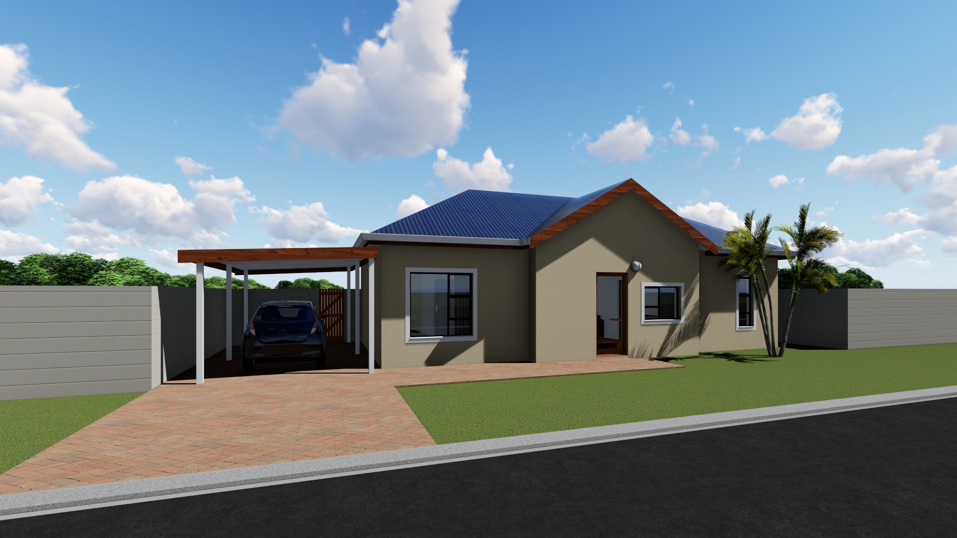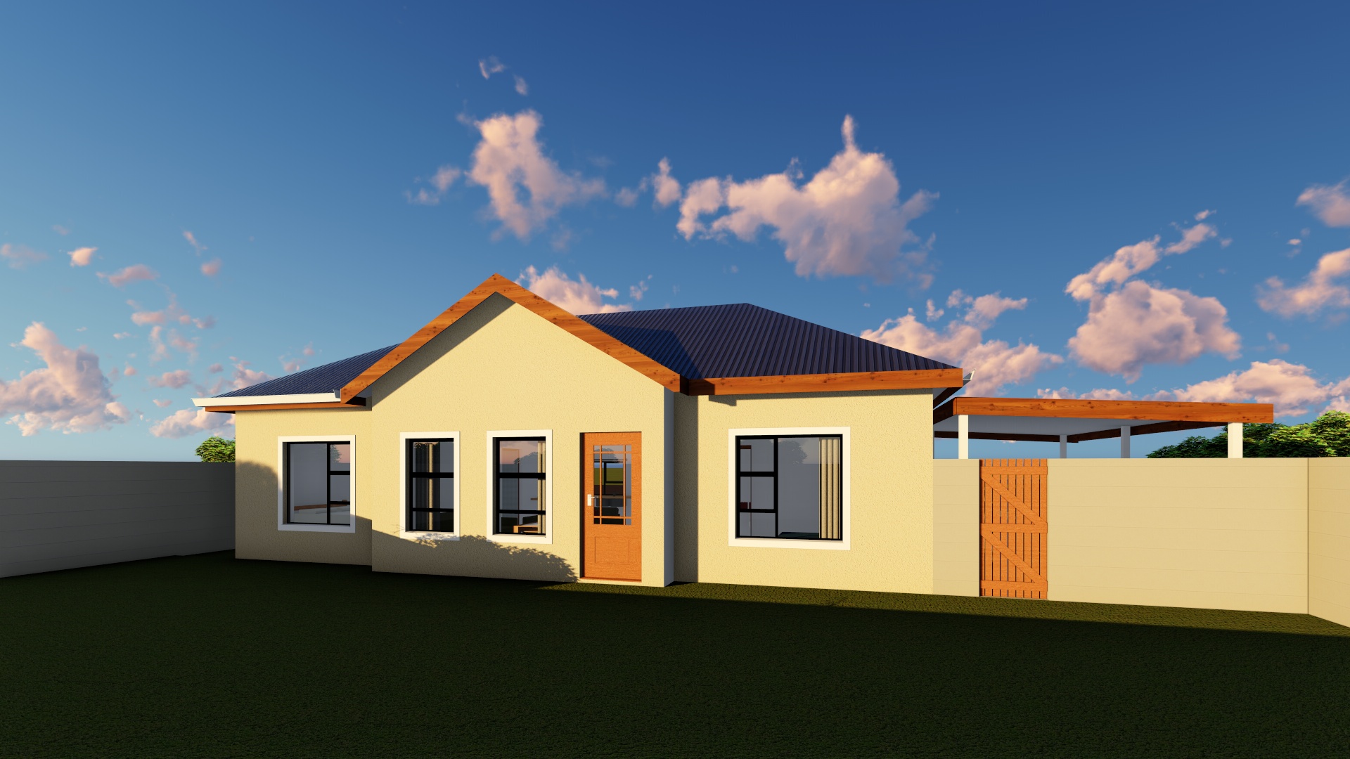 This is a very economical designed three bedroom house. The Lounge area and two bedrooms have been designed to face north and capture maximum light and sun in colder seasons. The entrance leads into the Lounge Area with an Open Plan Kitchen on the side. The kitchen has a stove, sink and fridge. Both Bedrooms have built-in cupboards. The bathroom has a shower, hand basin and a WC.