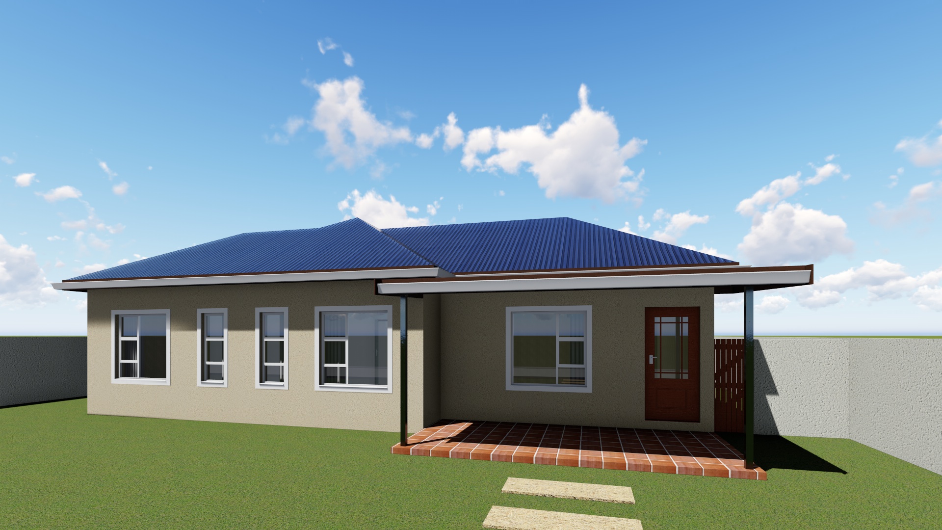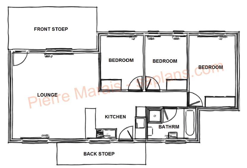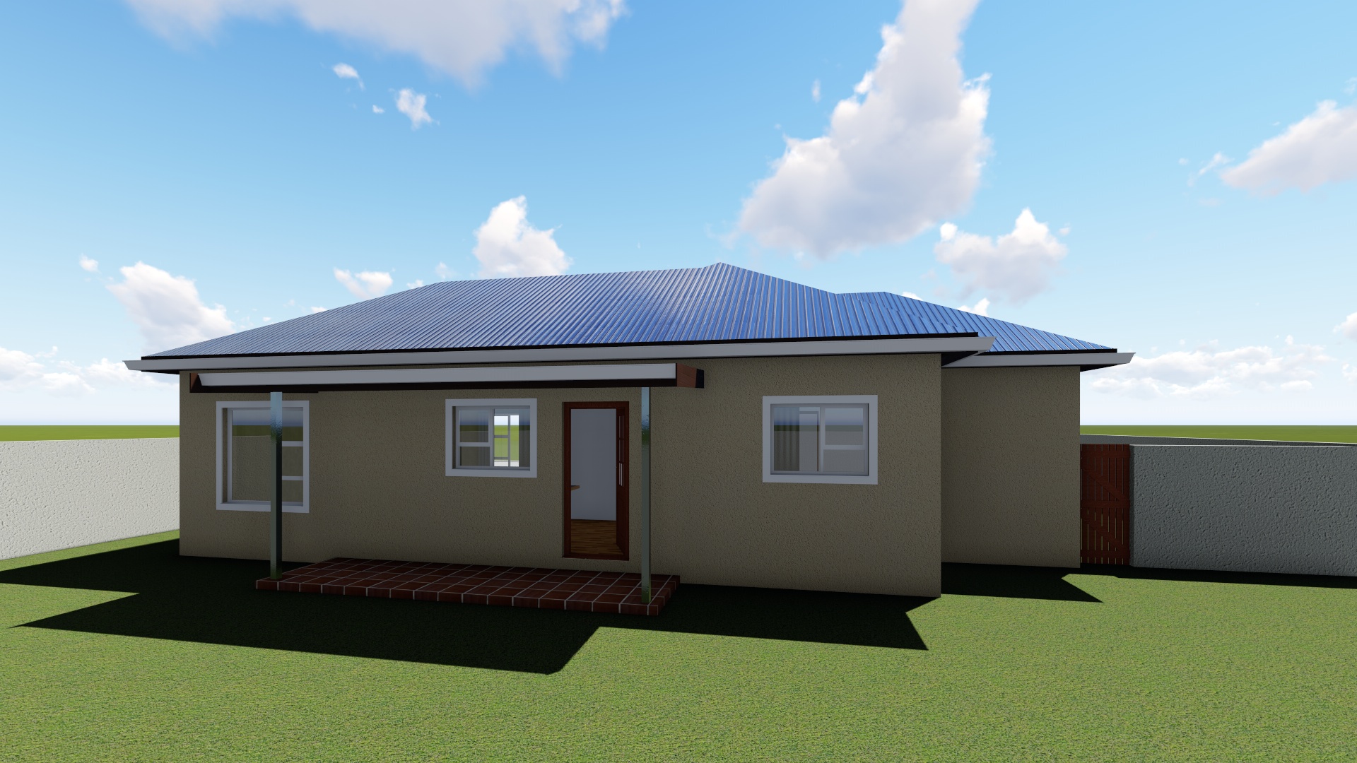This is a very economical designed three bedroom house. The Lounge area and all 3 bedrooms have been designed to face north and capture maximum light and sun in colder seasons. The entrance leads into the Lounge Area with an Open Plan Kitchen on the side. The kitchen has a stove, sink and fridge. Both Bedrooms have built-in cupboards. The bathroom has a shower, hand basin and a WC.