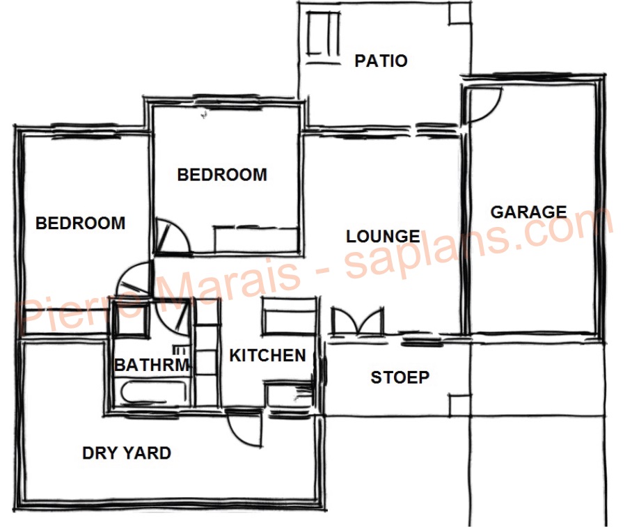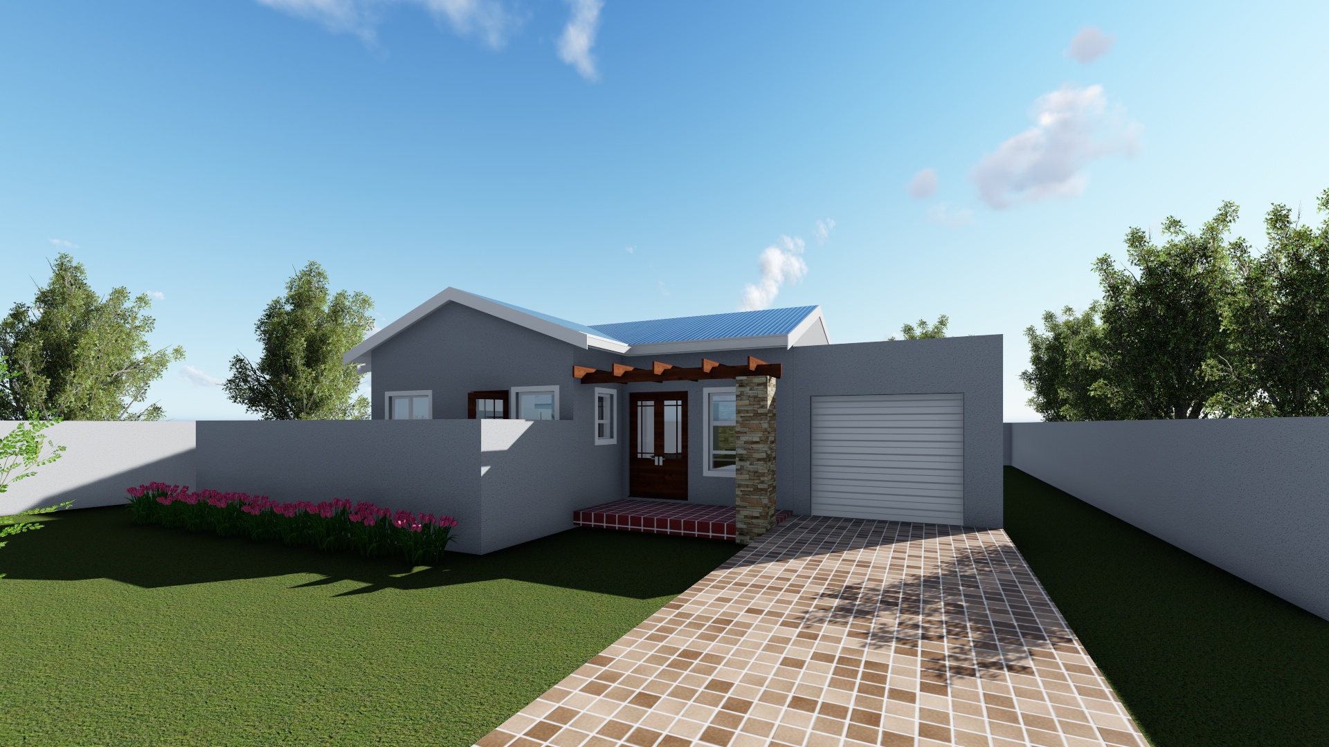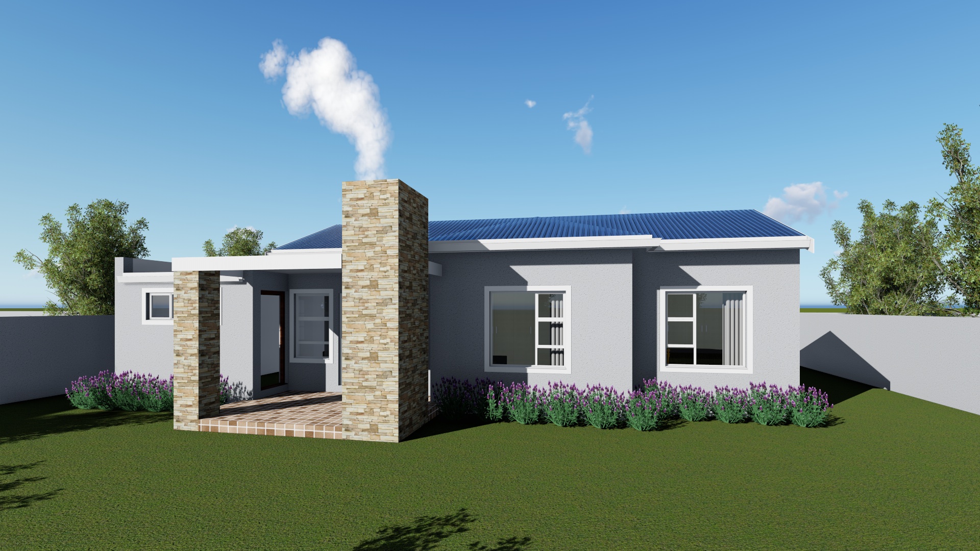 This is a very economical designed two bedroom house. The Lounge area and both bedrooms have been designed to face north and capture maximum light and sun in colder seasons. The entrance leads into the Lounge Area with an Open Plan Kitchen on the side. The kitchen has a stove, sink and fridge. Both Bedrooms have built-in cupboards. The bathroom has a shower, hand basin and a WC.